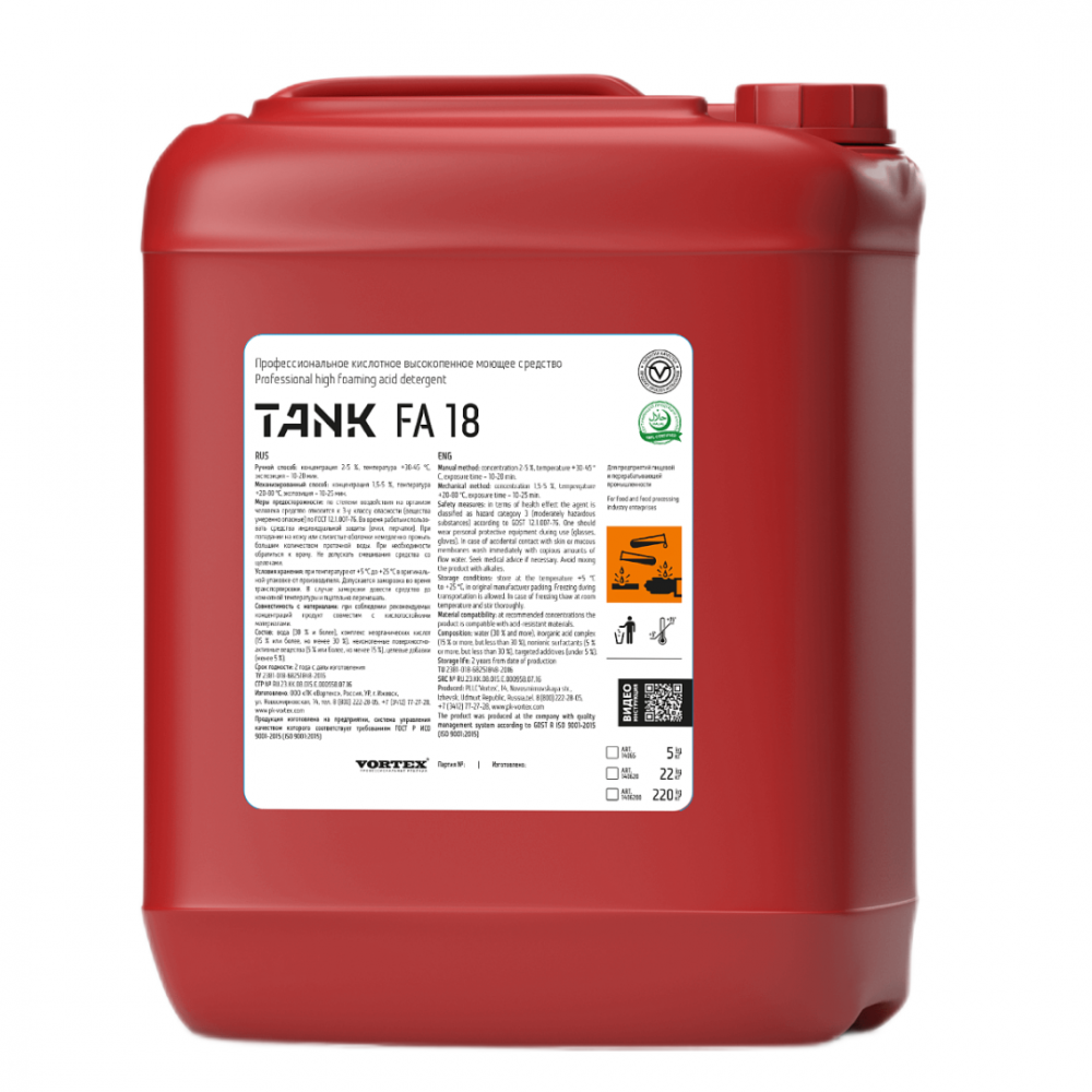 Рекомендуется для обработки поверхностей из кислотостойких материалов. Образует обильную пену, равномерно распределяется, облегчая мойку. Рабочая концентрация: 2–5%, температура 30–50 °C, время экспозиции 10–20 минут. pH — 2. Идеальное решение для предприятий пищевой промышленности и клининга.